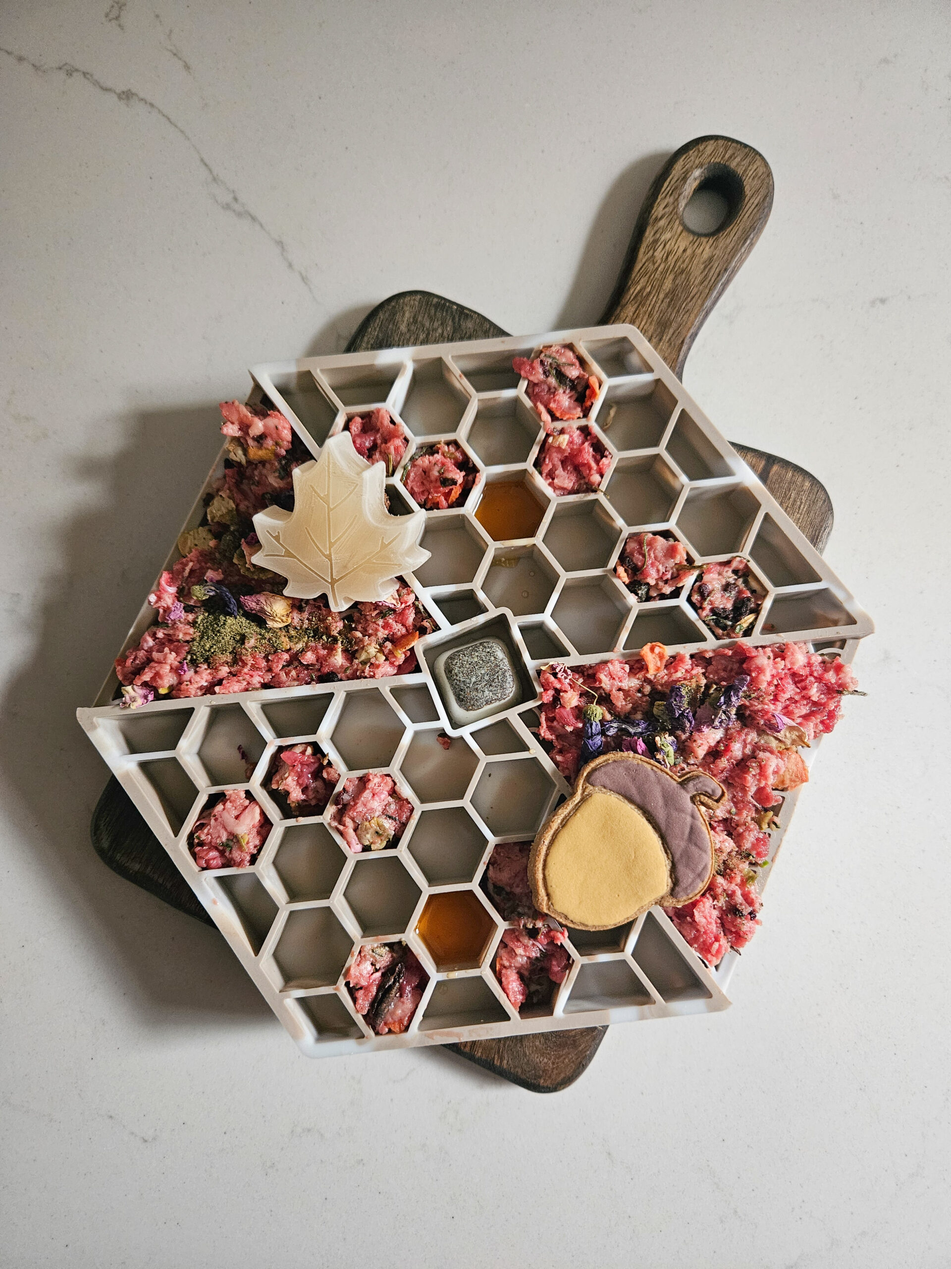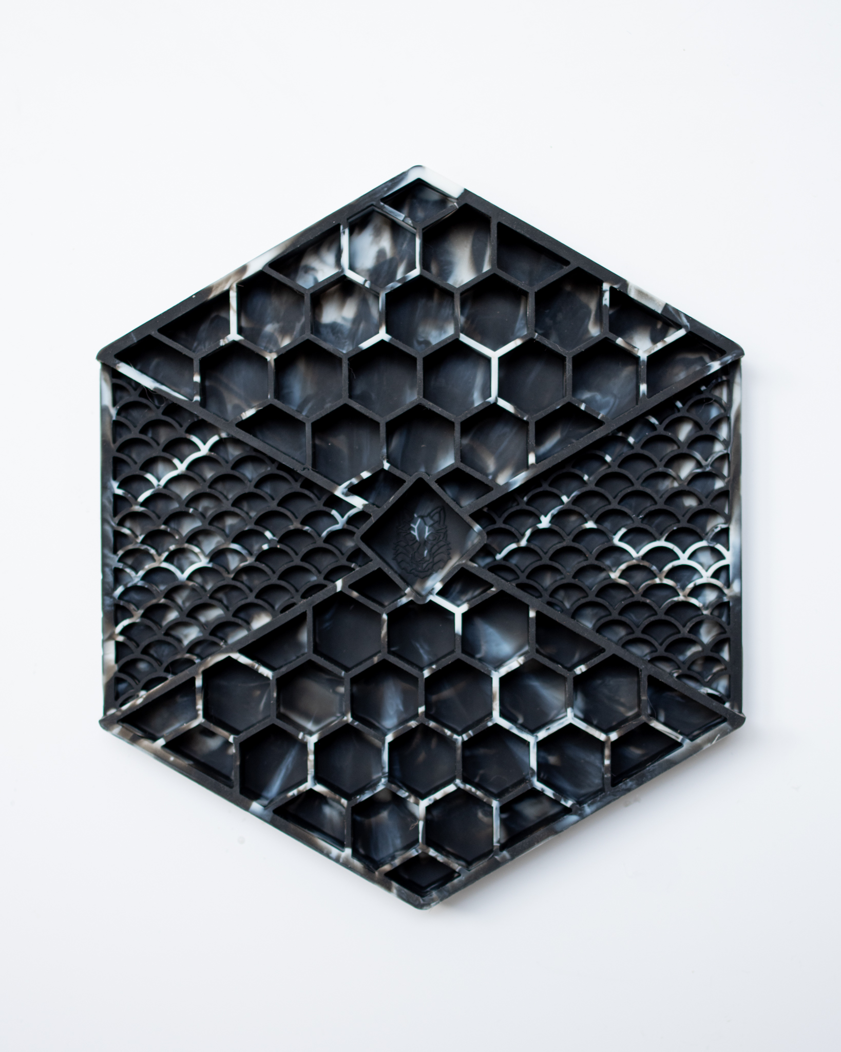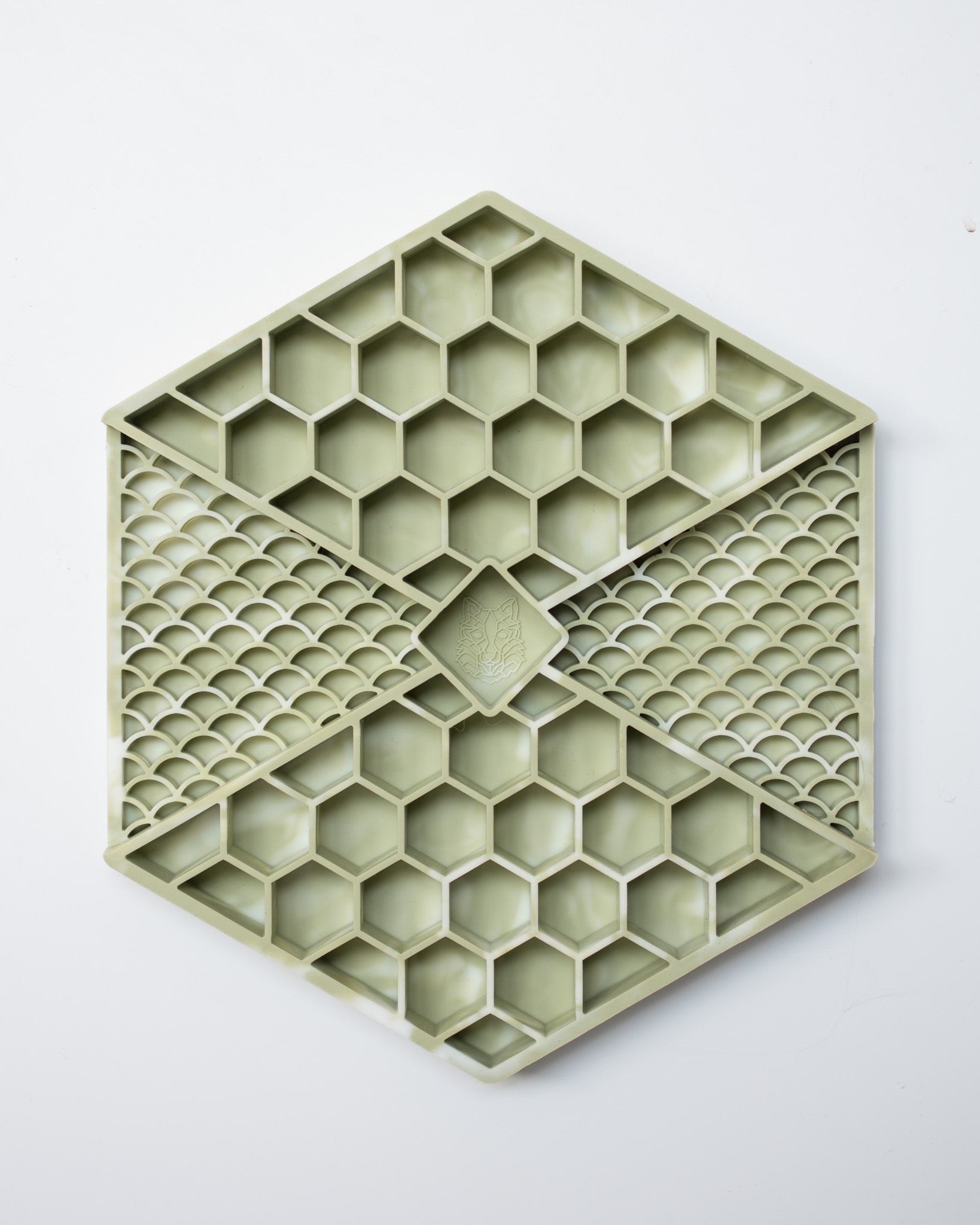Er past 300 gram vlees in de LIEVICK LICKMAT (als alleen de hexagon vormen gevuld worden). Als de scales ook gevuld worden, kan er uiteraard nog meer in.